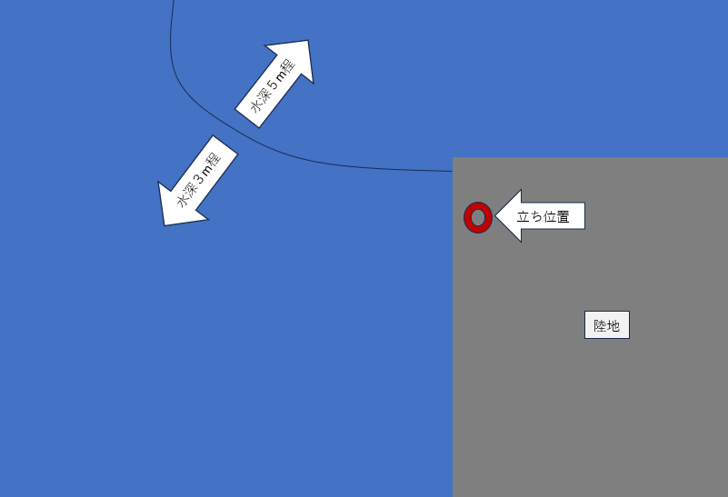 このような地形で,漁港の堤防の先端にはブレイクがあり、その近辺には所々藻が生えているというロケーションになります。