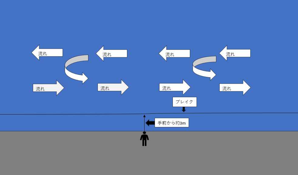 なるべく流れに逆らわないように引いてきて、手前のブレイクに差し掛かった時!!