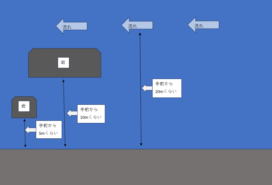 巻いてみると先ほどとは状況が変わり、上の図のように、潮が右から左に向かって流れている模様。