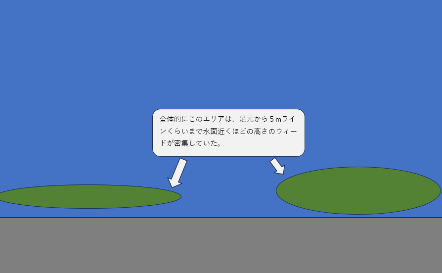まずは目の前にあるウィード帯の切れ目をマリコロングでリサーチ!