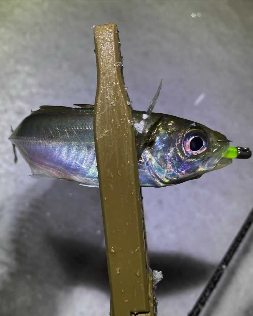 1月初旬~中旬は主に大型などは外海の居心地がいい水温についておりショアから釣れる魚は最大20cm~豆サイズを中心にたまに気温が高くなった日など深場が隣接するエリアなどでは20cm後半や尺サイズが釣れたりしていましたが、時折降った雪の影響などで比較的浅場に来てもすぐに居なくなりまた水温が安定する深場に戻りそこに居つくということも何回かあり、ただ水温が安定している場所(工場などの温排水や深場)はかなり安定して魚がおりサイズも時折浅場にさしてきていた20cm後半から尺サイズがメインになっていました、また1月下旬になるころにはいままで浅場にいた20cmクラスのアジもほとんどが抜けほぼ豆アジサイズのみとなっていました。